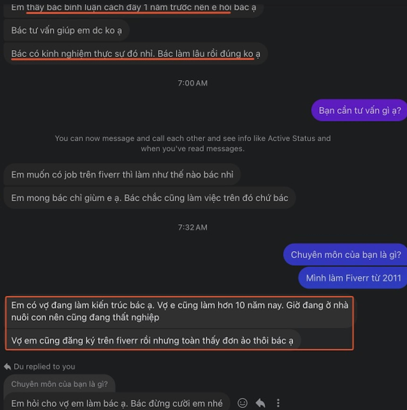 Anh kể: vợ anh là kiến trúc sư, làm hơn 10 năm. Hiện đang ở nhà nuôi con nhỏ, tạm thời không đi làm. Đã tự đăng ký lên Fiverr để tìm việc làm thêm, nhưng toàn nhận được đơn ảo, không biết vấn đề ở đâu.